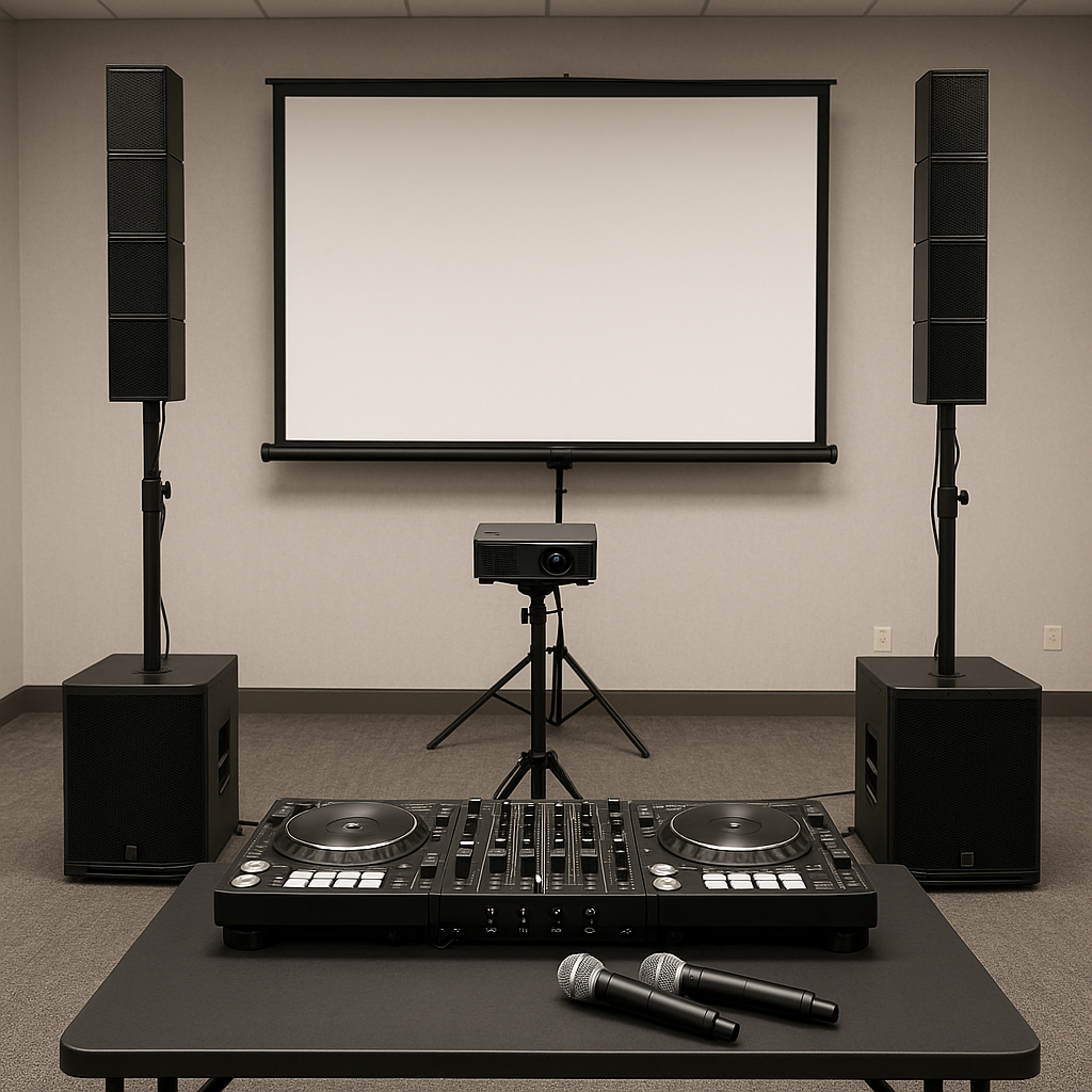 I provide a complete, polished audio-visual experience for presentations, corporate events, and social gatherings. Every setup includes two professional line-array speakers for clear, room-filling sound, a premium DJ booth or table setup, and two wireless microphones for seamless speaking, hosting, or audience interaction.