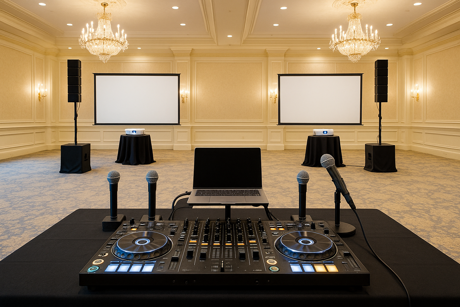 My Basic DJ Service provides a clean, professional setup designed for hotel events, corporate functions, weddings, and private celebrations. This package includes two powerful line-array speakers for clear, consistent sound throughout the room, along with a sleek DJ booth or table setup that maintains a premium, organized appearance.